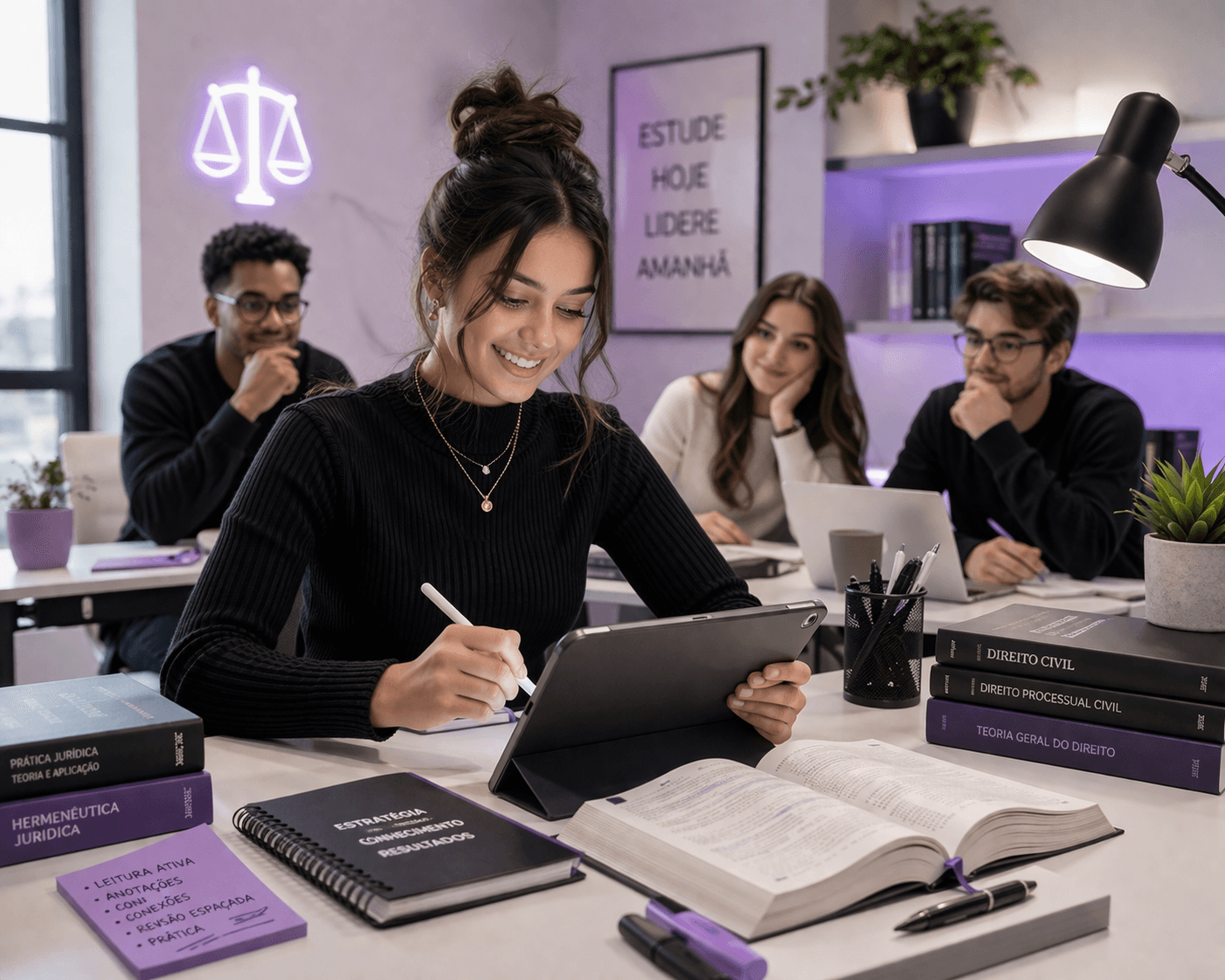 Lições curtas e sequenciais que ligam teoria à decisão, com apoio de IA para fundamentar cada escolha — método validado, do estudo ao escritório.
